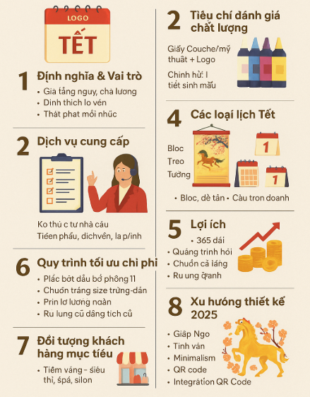 Khám phá quy trình chi tiết “lịch tết thiết kế theo yêu cầu” – từ khảo sát ý tưởng, thiết kế, in ấn đến giao hàng. Hiểu rõ tiêu chí chất lượng, lợi ích kinh doanh và bí quyết tối ưu chi phí để mỗi cuốn lịch tết trở thành “đại sứ” thương hiệu, ghi dấu ấn sâu đậm trong lòng khách hàng.