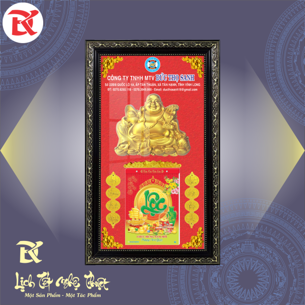 - Lịch Phật Di Lặc, kích thước 42x69cm - Khung vân gỗ bản 5cm, nền ván MDF tráng gương - Lốc lịch 17x24cm